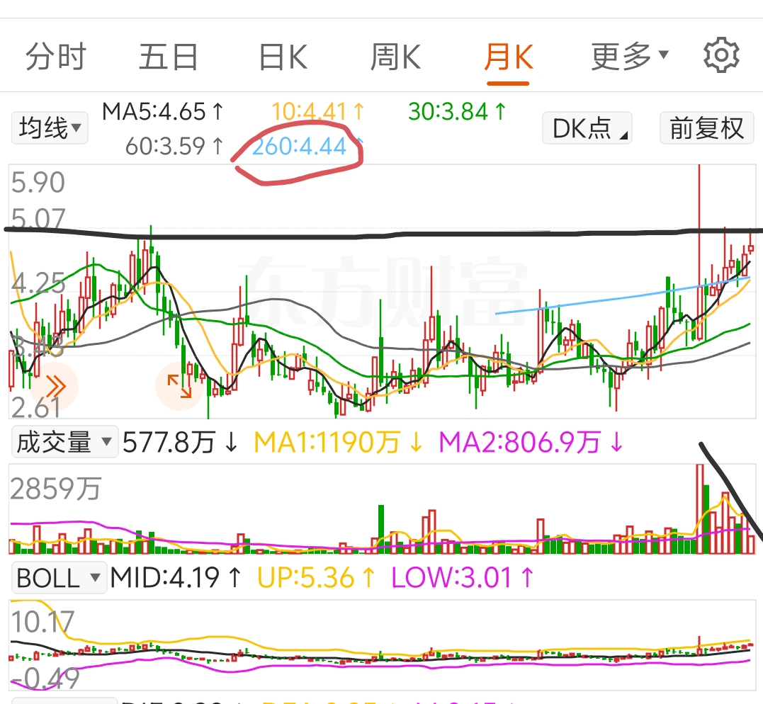 260月线形成支撑,月线级别冲击五元已三次,月线成交量为递减量,月线蓄势已久,应