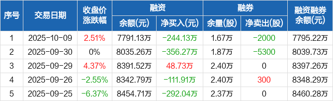 融资方面,当日融资买入77.66万元,融资偿还321.78万元,融资净偿还244.13万元。融券方面,融券卖出4900股,融券偿还6900股,融券余量1.67万股,融券余额4.09万元。融资融券余额合计7795.22万元。