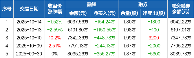 融资方面,当日融资买入232.88万元,融资偿还387.13万元,融资净偿还154.24万元,连续5日净偿还累计2353.97万元。融券方面,融券卖出0股,融券偿还1800股,融券余量1.8万股,融券余额4.66万元。融资融券余额合计6042.22万元。
