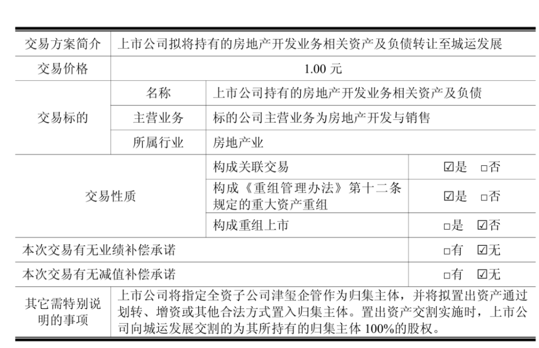 津投城开(600322)10月29日披露了《重大资产出售暨关联交易报告书(草案)》(下称“《草案》”),对此前重组方案进行调整。公告显示,公司拟将持有的房地产开发业务相关资产及负债转让至天津城市运营发展有限公司(下称“城运发展”),交易对价为1元。