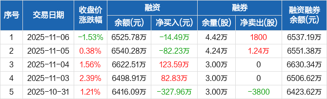 津投城开:融资净偿还14.49万元,融资余额6525.78万元(11-06)