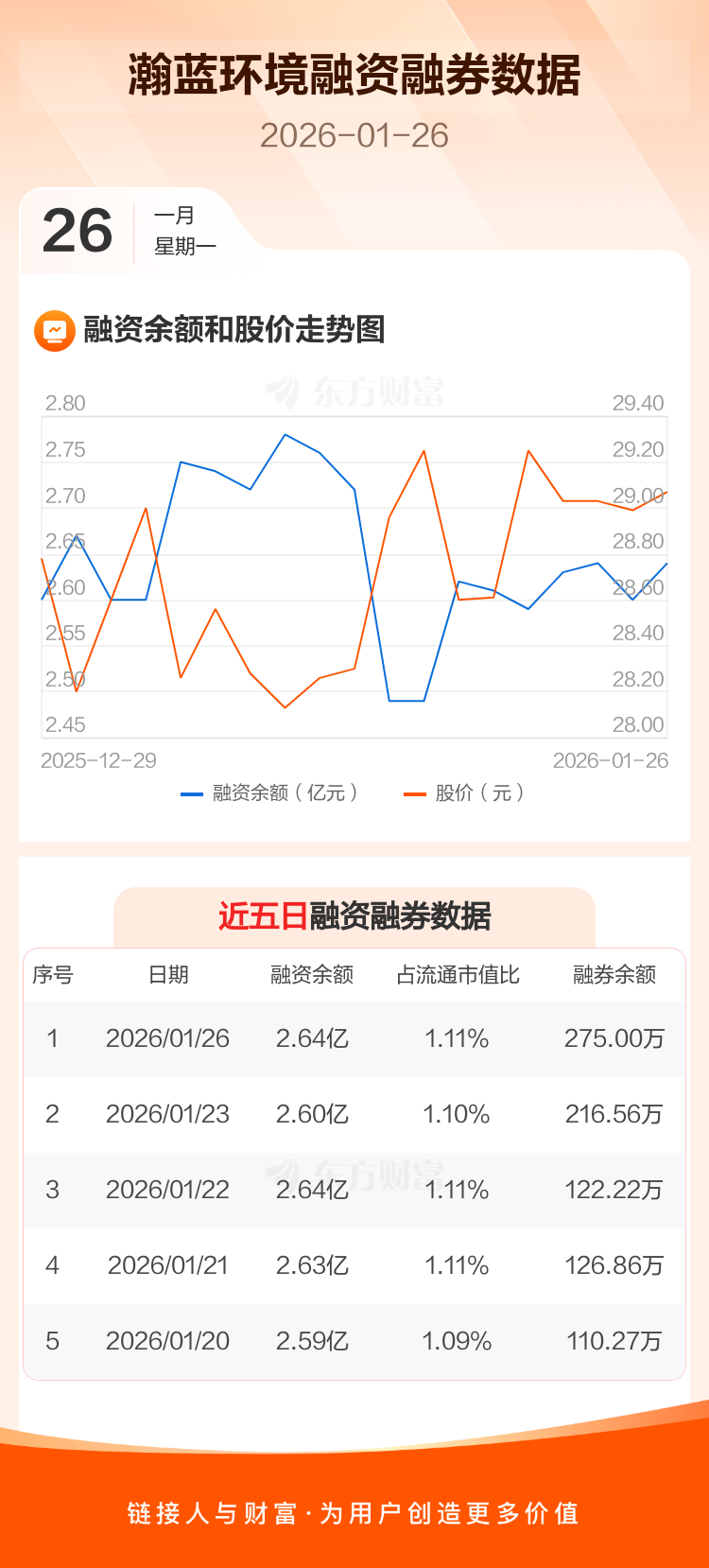 交易所最新数据显示,瀚蓝环境于2026年1月26日获融资买入1473.82万元,融资偿还1122.18万元,当日融资净买入351.64万元。目前,该股融资余额2.64亿,占流通市值比例为1.11%。