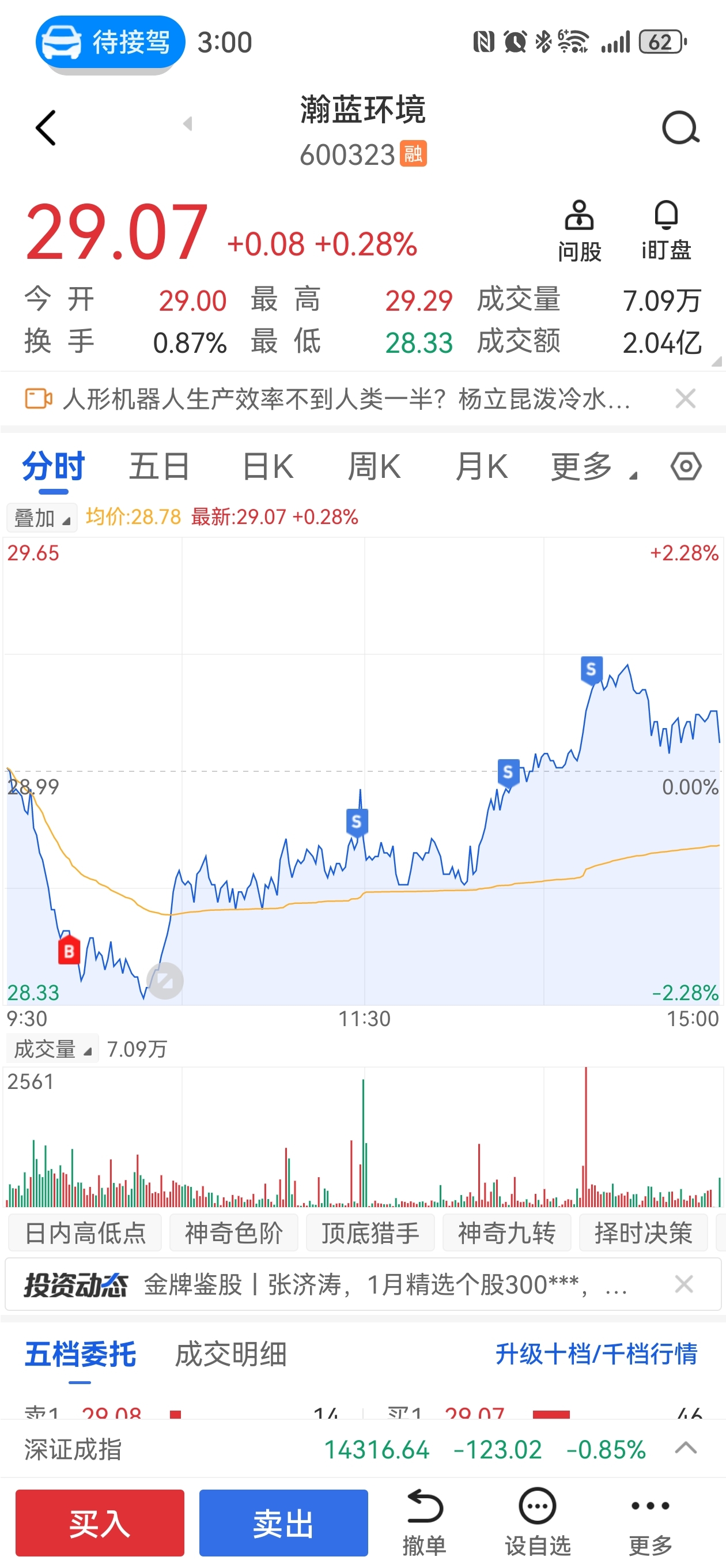 $瀚蓝环境(SH600323)$ 短线昨天大幅减仓,今天把剩下的10手也清掉利润落袋,赚两张假期机票吧。短线有两个条件还可以进场,一是放量突破29.3站稳,二是短期再次调整到120均线附近做尝试性买入。