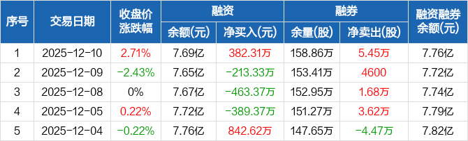 融资方面,当日融资买入3757.69万元,融资偿还3375.38万元,融资净买入382.31万元。融券方面,融券卖出6.06万股,融券偿还6100股,融券余量158.86万股,融券余额721.22万元。融资融券余额合计7.76亿元。