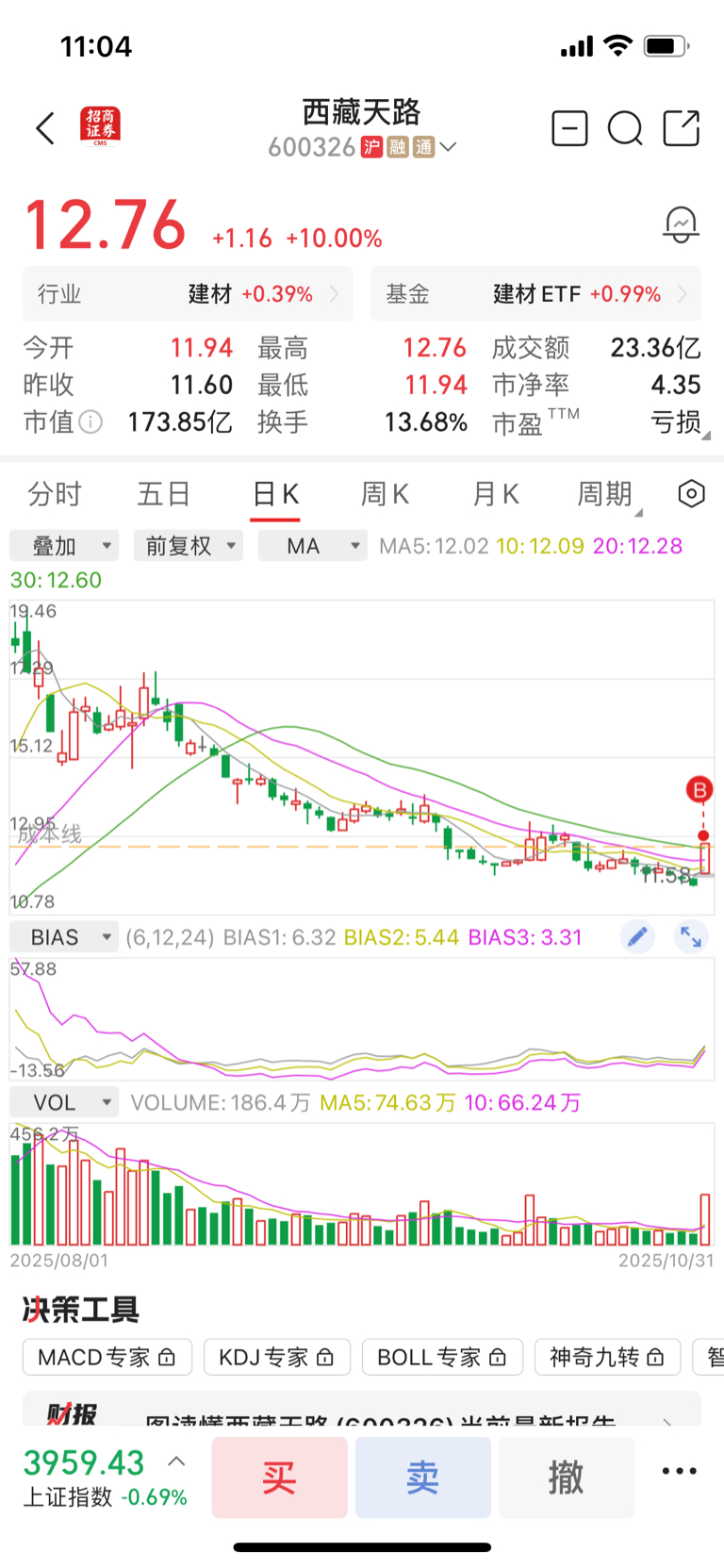 $西藏天路(SH600326)$ 今作总结,出了统一股份8个点附近进了天路,原因福建板块依旧很强势而统一没跟说明不走湾湾路线,进天路原因也很简单,底部,突然放巨量拉到5个点往上,肯定是有一波,大行情,所以就果断介入,然后看了下消息面10.29有关于西藏发展的论坛