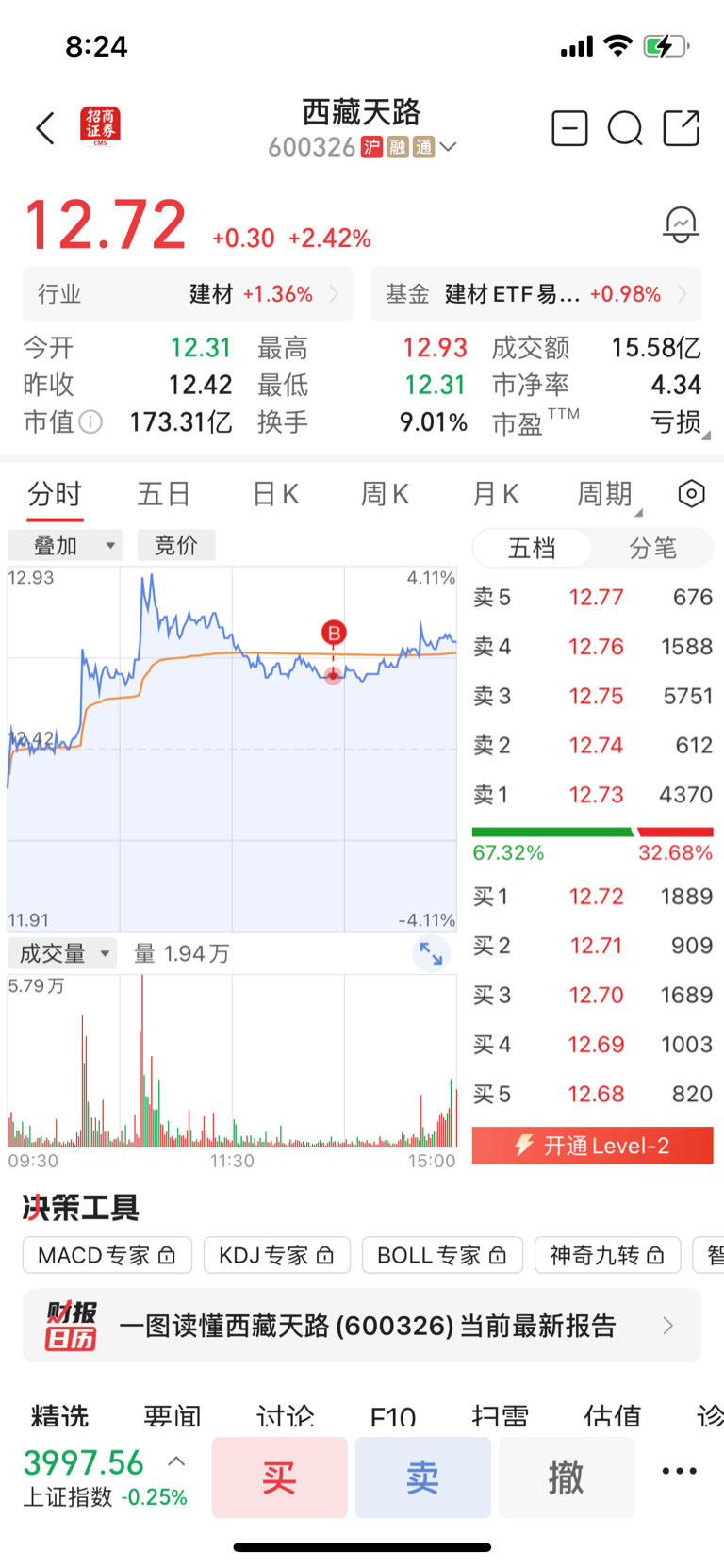 $西藏天路(SH600326)$ 奶奶的上周好不容易打个板,还来个低开低走,我又回来了