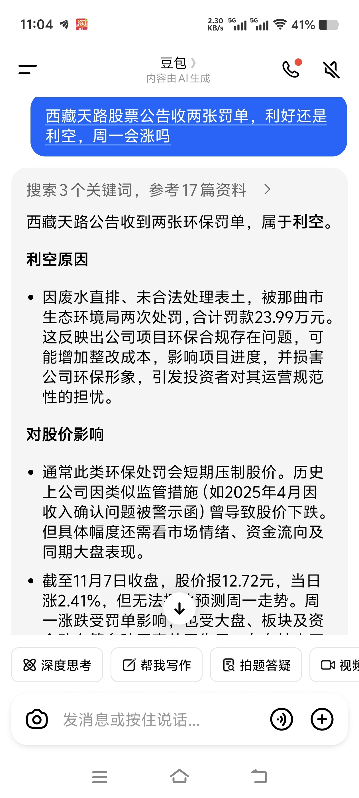 $西藏天路(SH600326)$ 罚单是到底利好还是利空啊,周一会怎样!