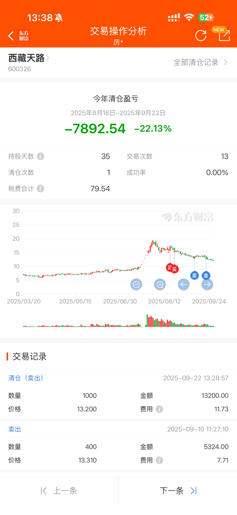 我就发现了,他是不可能回到13的,不为什么,因为我割肉了之后,都会庆幸我割的早,