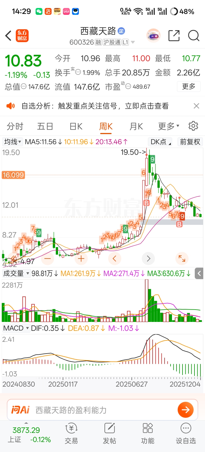 $西藏天路(SH600326)$ 两次购买均买在顶点,成本16.2,天路吾草霓大麻。坚决不卖,不信不回本。