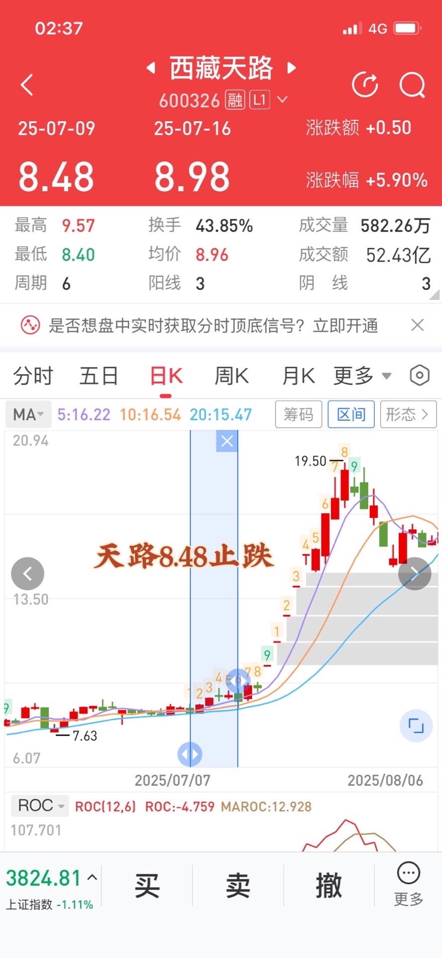 $西藏天路(SH600326)$ 8.48是天路止跌线 ……