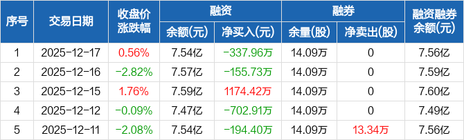 西藏天路:融资净偿还337.96万元,融资余额7.54亿元(12-17)