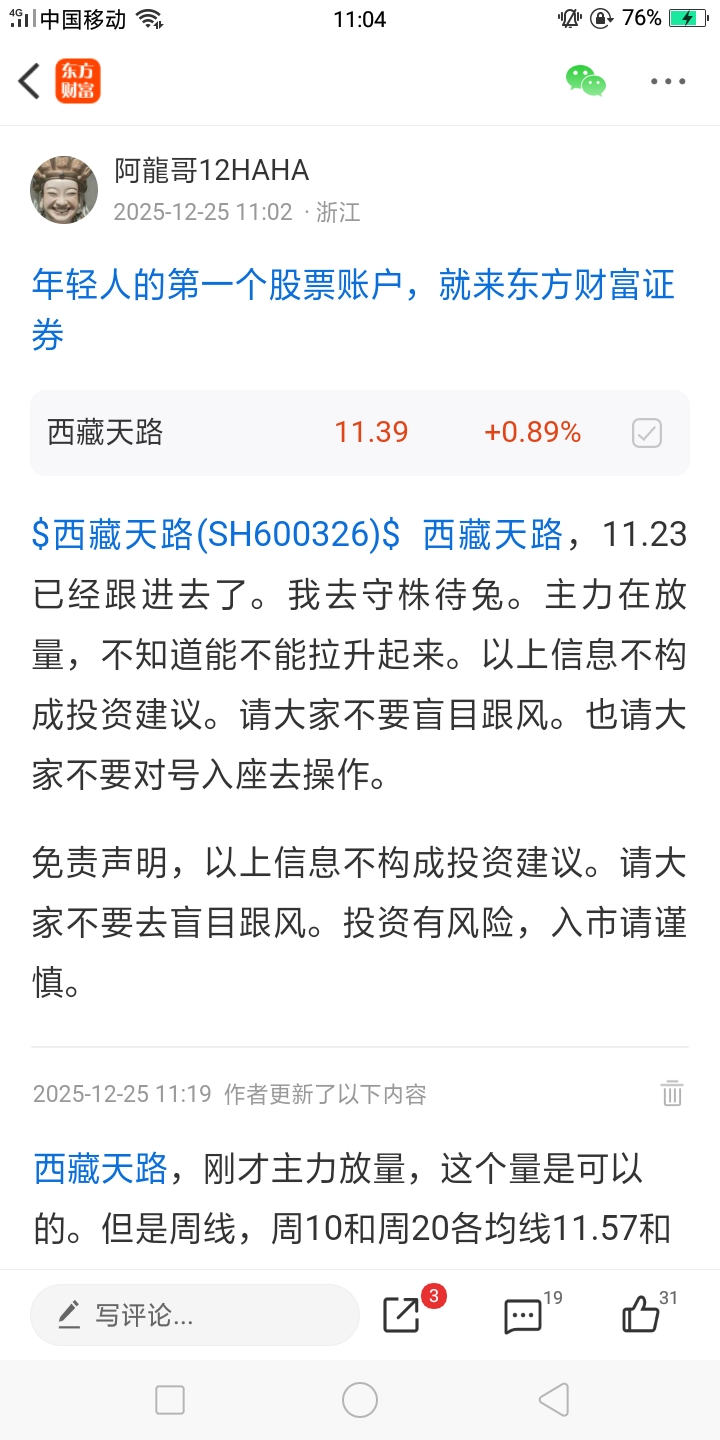 $西藏天路(SH600326)$ 西藏天路,刚才主力试盘放量了哦。要开启往上走了哦。我跟进去好多天了。终于上来啦。主力你继续磨蹭呀,看谁耗得住谁。刚才主力放量试盘了哦。以上信息不构成投资建议,请勿跟风操作。