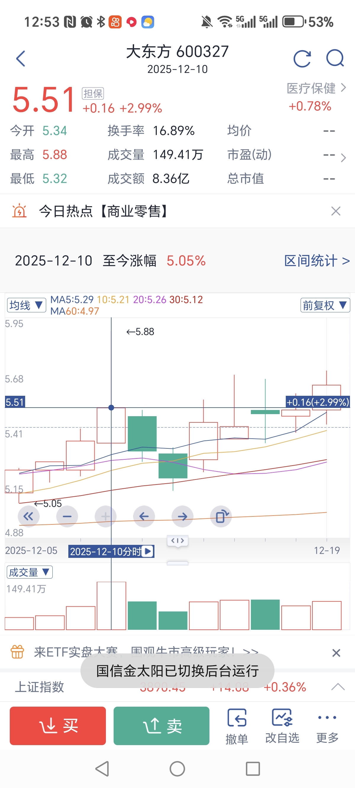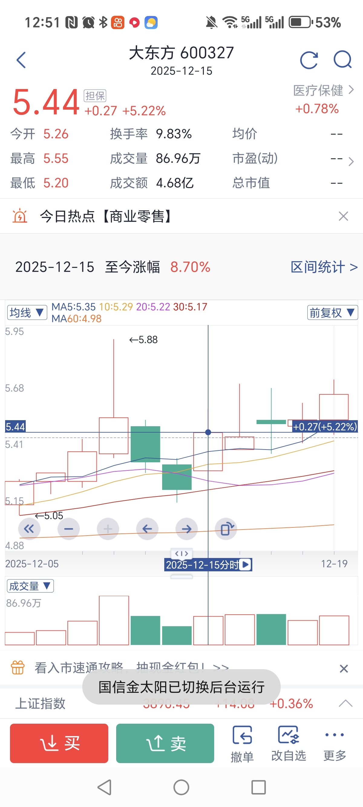 周一不知道还会不会回踩5.44一下,5.51位置都不一定能到,观察这股就会发现,