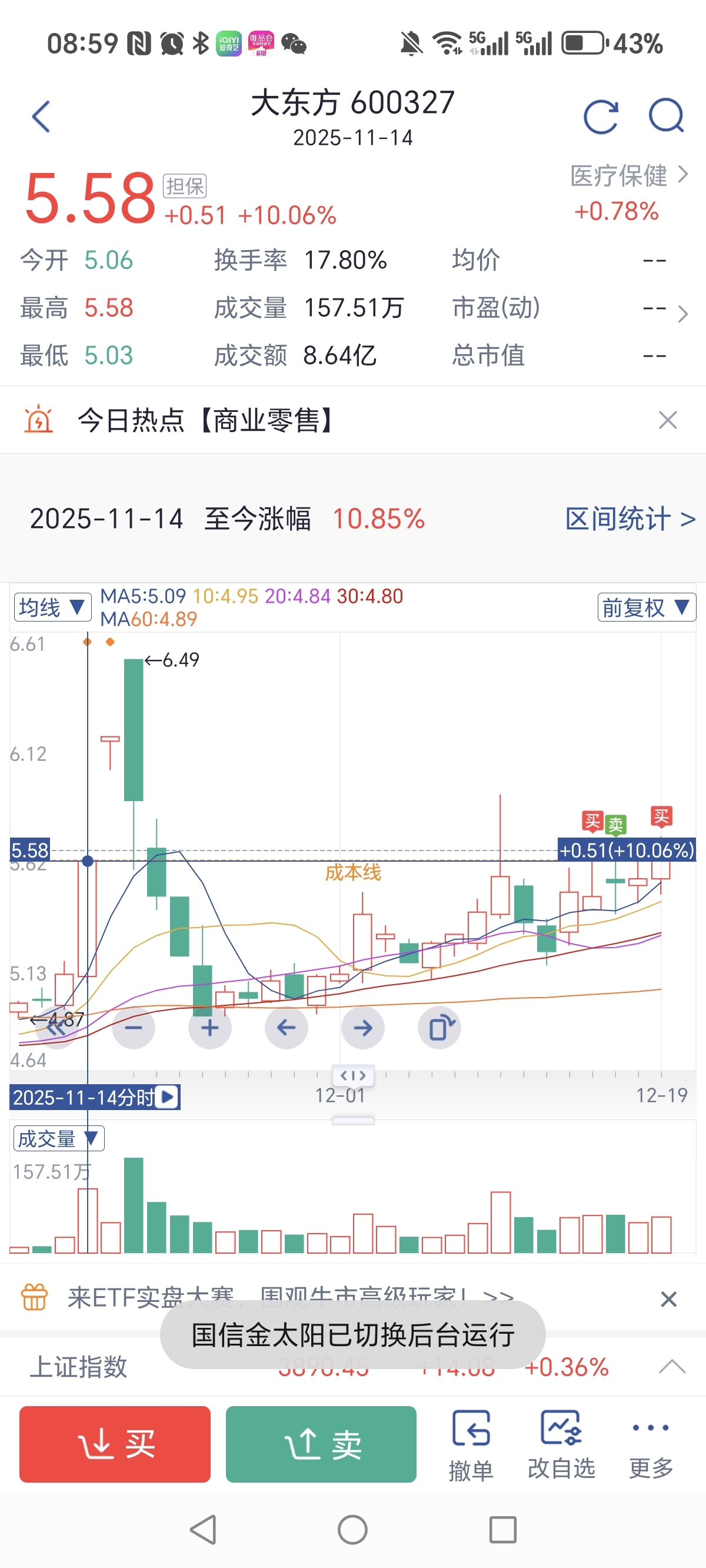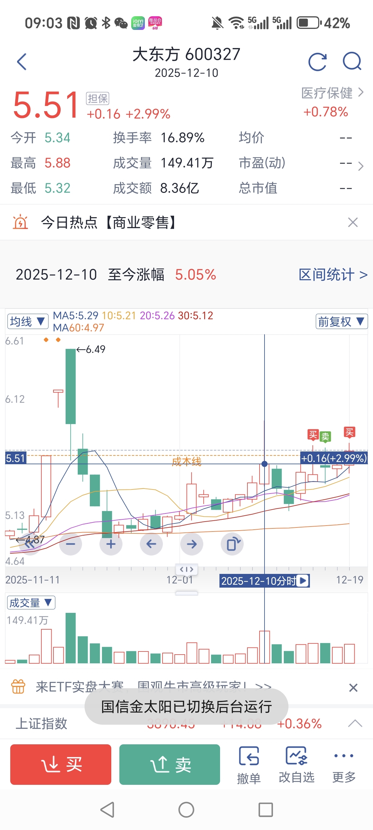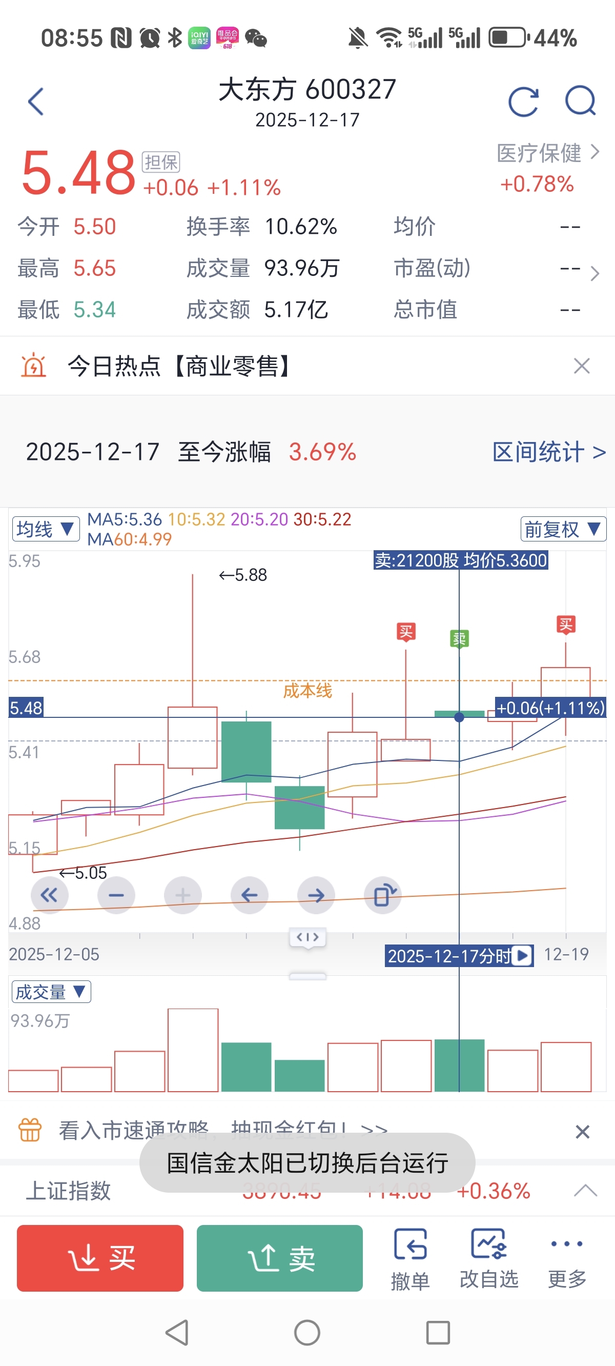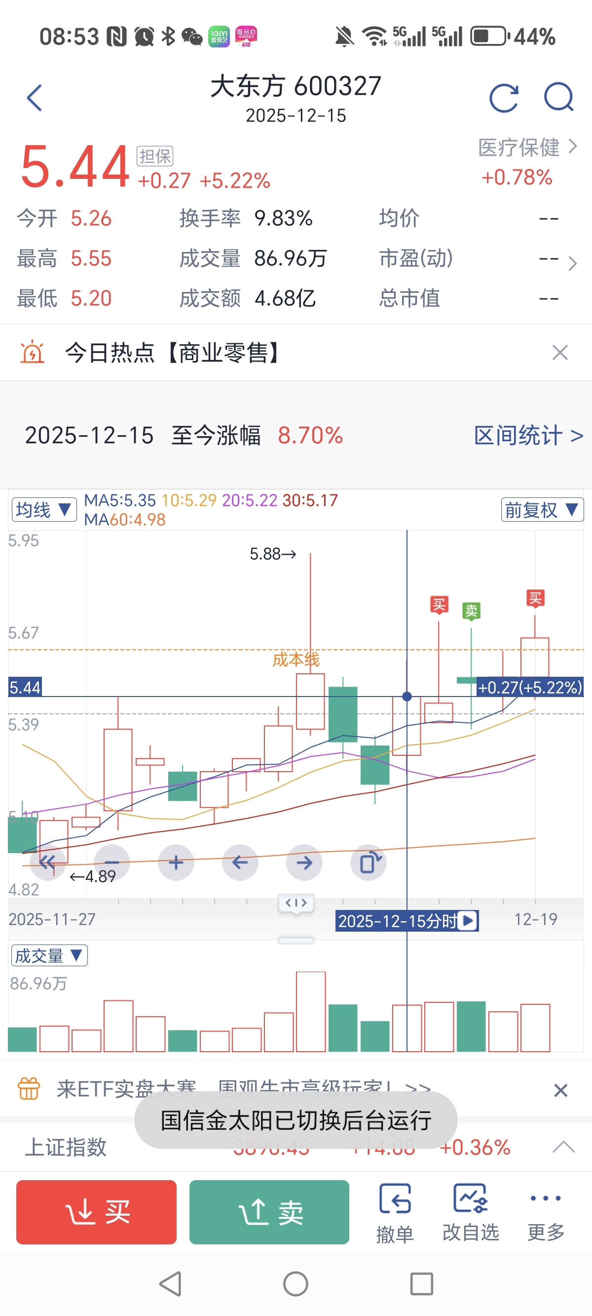 $大东方(SH600327)$ 这个后第一次放量5.44位置,隔天跳空高开5.50,庄已经蹦跶不了多久了兄弟们,做多意愿强烈,今天开盘5.50伴随着比昨天的量能小阳,这种市场的lj庄确实讨厌,天天就拉几个点就做T,不过明天要是能放量突破5.88就是启动,这种庄一辈子吃不起两个菜