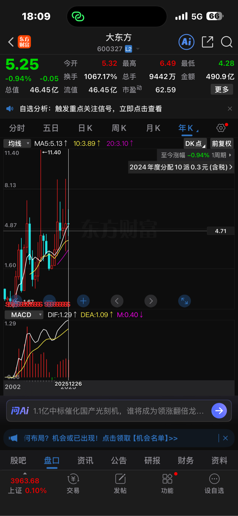 $大东方(SH600327)$ 从2002年拿到现在 今年25年不错还差几天就是整整一年了 今年目前亏不到1% 期待最后几天能翻红
