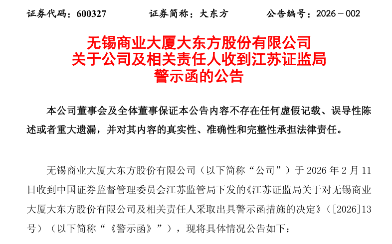 2月11日,大东方(600327)发布公告,公司及财务总监徐文武因违规行为,被采取出具警示函措施。