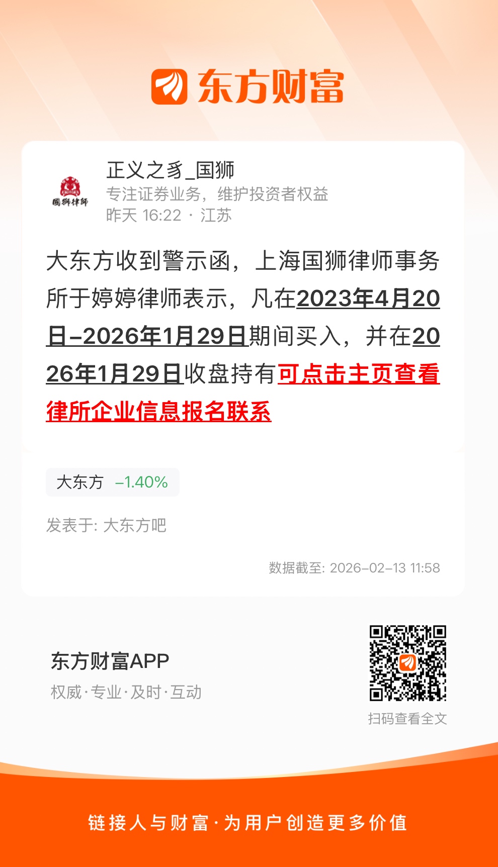 大东方收到警示函,上海国狮律师事务所于婷婷律师表示,凡在2023年4月20日-2026年1月29日期间买入,并在2026年1月29日收盘持有可点击主页查看律所企业信息报名联系