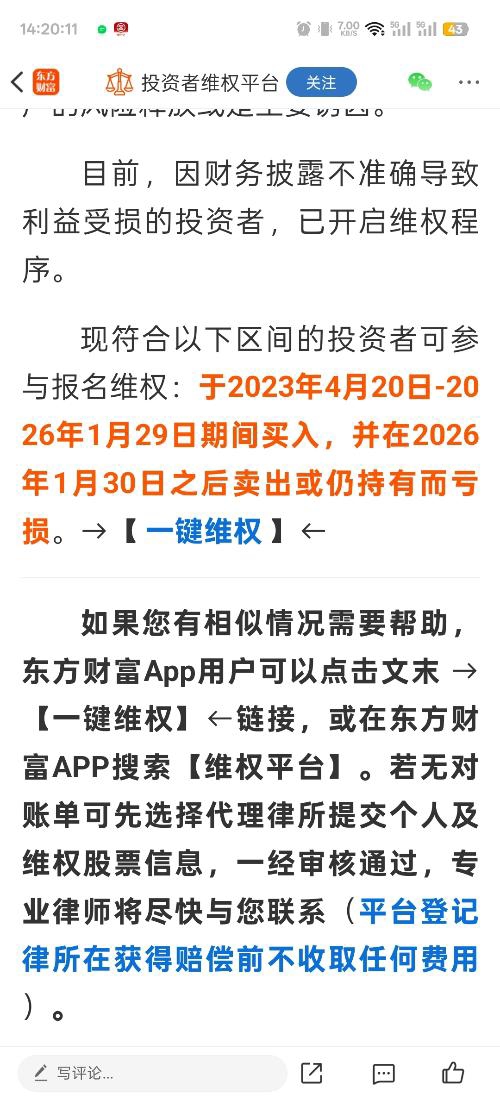 $大东方(SH600327)$ 东财平台关联的律所说:赔偿下来之前不收任何费用。大家索赔吧,前期不收费,人多力量大。自己的利益不争取,谁管你