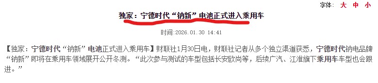 【独家:宁德时代“钠新”电池正式进入乘用车】财联社1月30日电,财联社记者从多个独立渠道获悉,宁德时代钠电品牌“钠新”即将在乘用车领域展开公开冬测。“此次参与测试的车型包括长安欧尚等,后续广汽、江淮旗下乘用车车型也会跟进。”