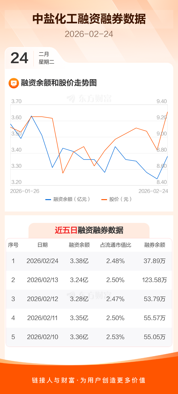 交易所最新数据显示,中盐化工于2026年2月24日获融资买入4446.31万元,融资偿还3048.11万元,当日融资净买入1398.19万元。目前,该股融资余额3.38亿,占流通市值比例为2.48%。