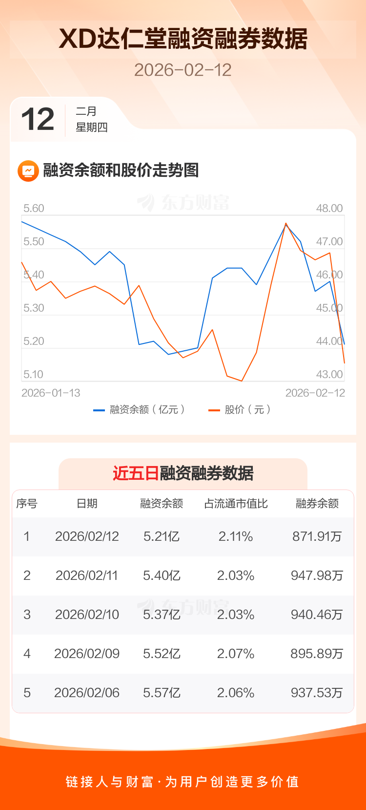 交易所最新数据显示,XD达仁堂于2026年2月12日获融资买入2207.94万元,融资偿还4126.38万元,当日融资净偿还1918.44万元。目前,该股融资余额5.21亿,占流通市值比例为2.11%。