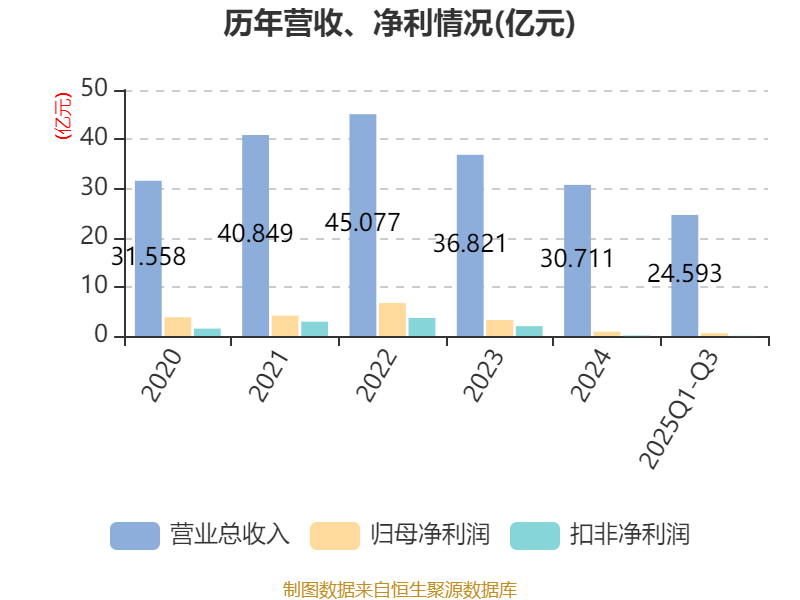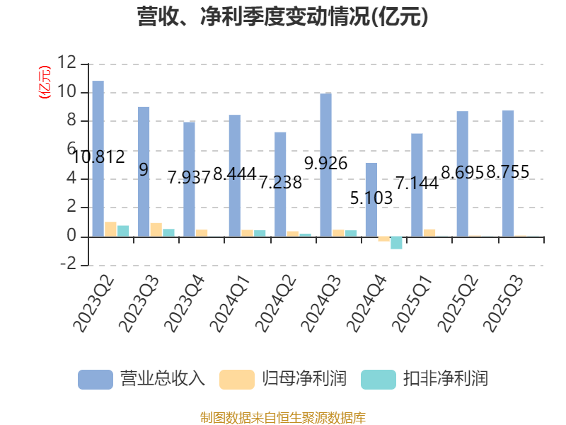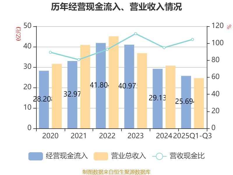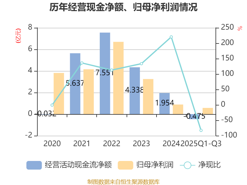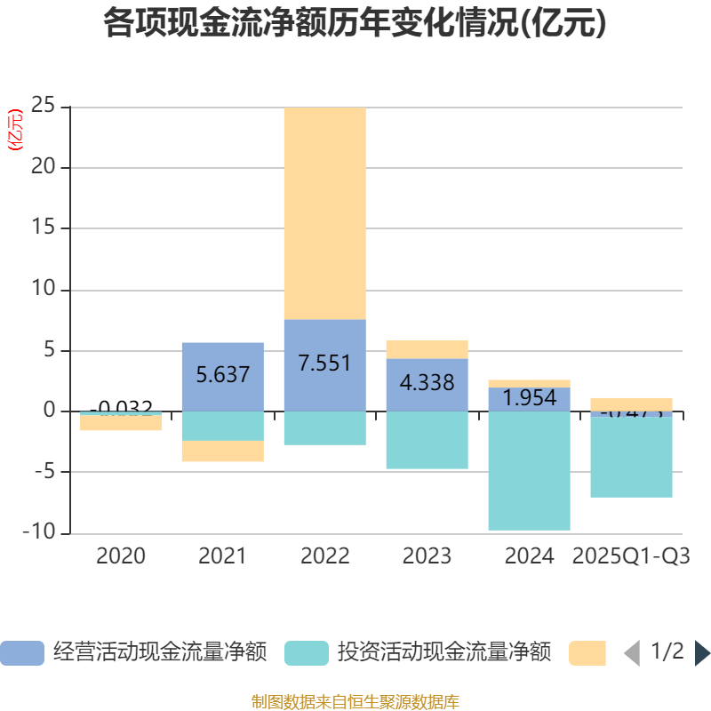 2025年前三季度,公司经营活动现金流净额为-4749.82万元,同比减少712.37万元;筹资活动现金流净额1.09亿元,同比减少1.4亿元;投资活动现金流净额-6.6亿元,上年同期为-7.78亿元。
