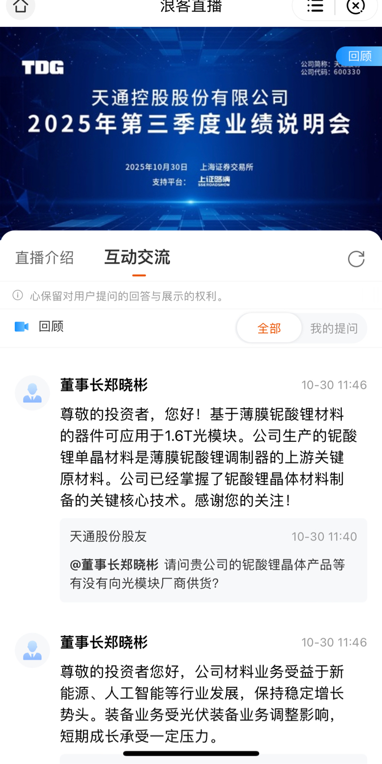 你们自己看,整天说薄膜铌酸锂材料,就是卖不出去,你们看看他的回答,有没