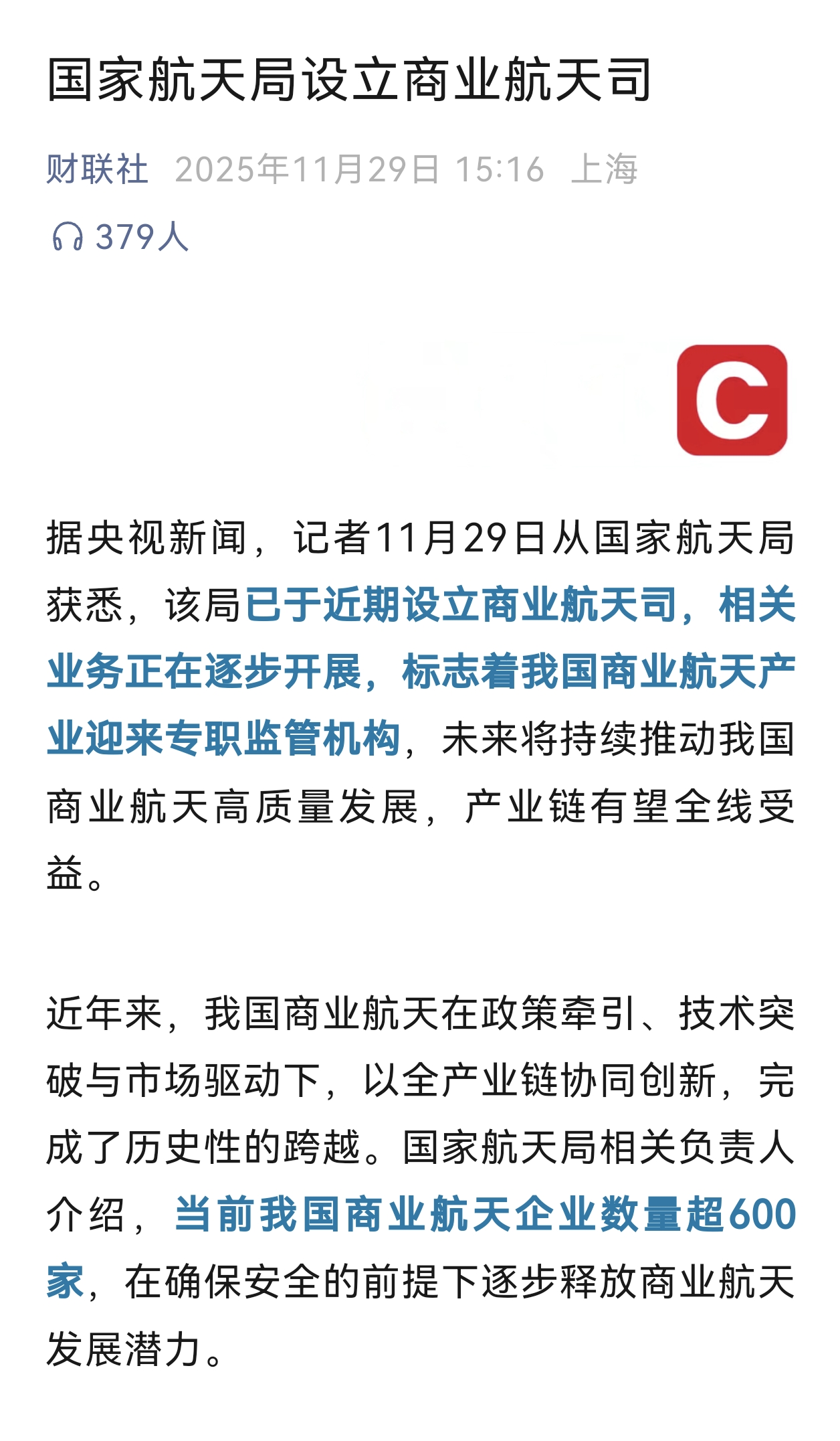 国家航天局设立商业航天司,进一步将航天业务下放,这对民营企业是巨大利好。别的民营