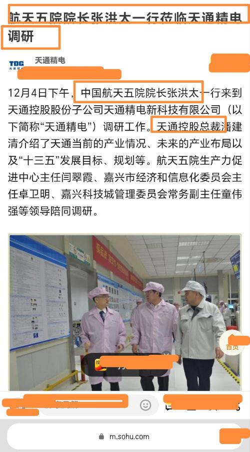 $天通股份(SH600330)$$航天发展(SZ000547)$$航天工程(SH603698)$天通精电官方号发文:中国航天五院院长来天通精电调研,实锤了航天集团和天通精电合作由来已久!天通股份今年11月份建成并投产的雷达卫星项目,可以确定就是专为中国航天的卫星制造而建的!希望量化可以抓爬到我发的这个重要的帖子,量化也确定天通股份是商业航天、卫星通信的最核心标的!拿出上亿资金来打板吧,量化!@广西南宁人