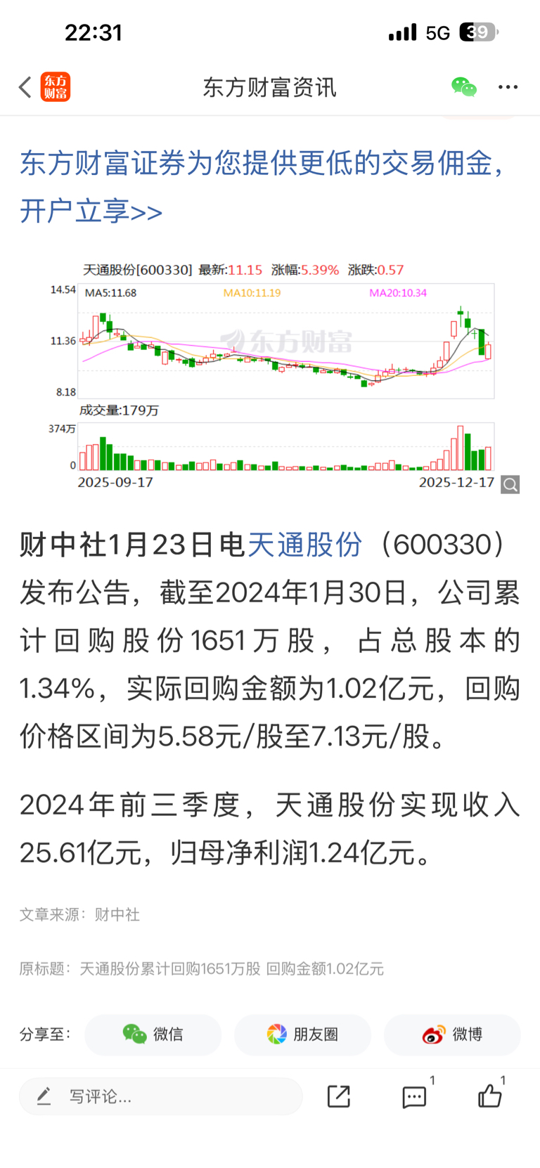 $天通股份(SH600330)$ 1月份已经回购1个亿了,看样子这家公司还是踏实做事的。