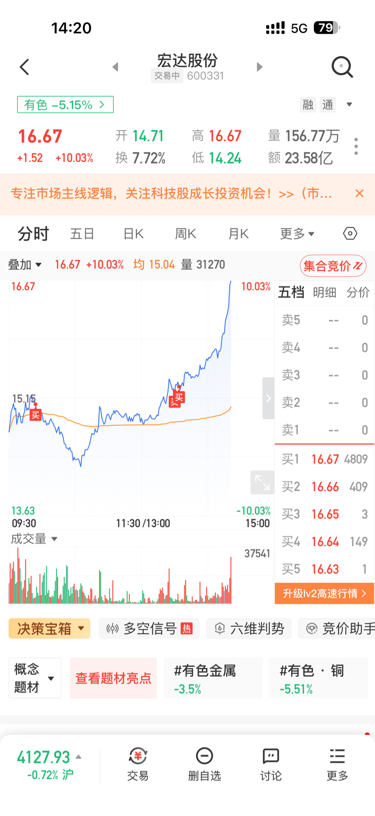 $宏达股份(SH600331)$ 虽然没有加到最低,但了解你的我在拉升前果断加码!我的达爷牛逼
