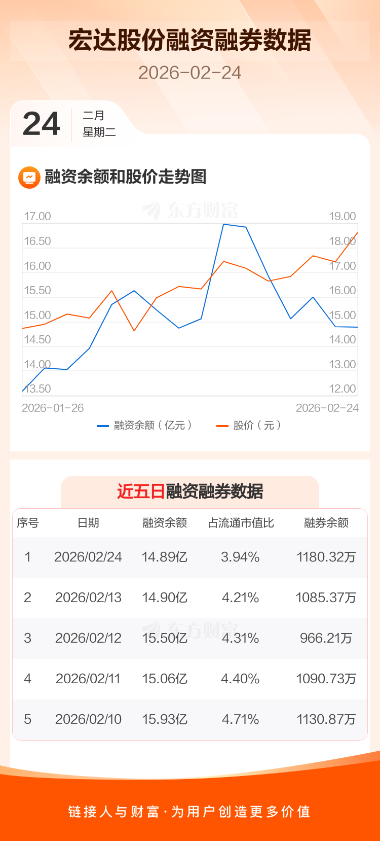 交易所最新数据显示,宏达股份于2026年2月24日获融资买入1.21亿元,融资偿还1.23亿元,当日融资净偿还141.93万元。目前,该股融资余额14.89亿,占流通市值比例为3.94%。