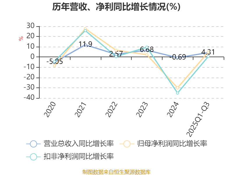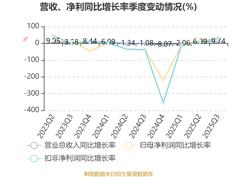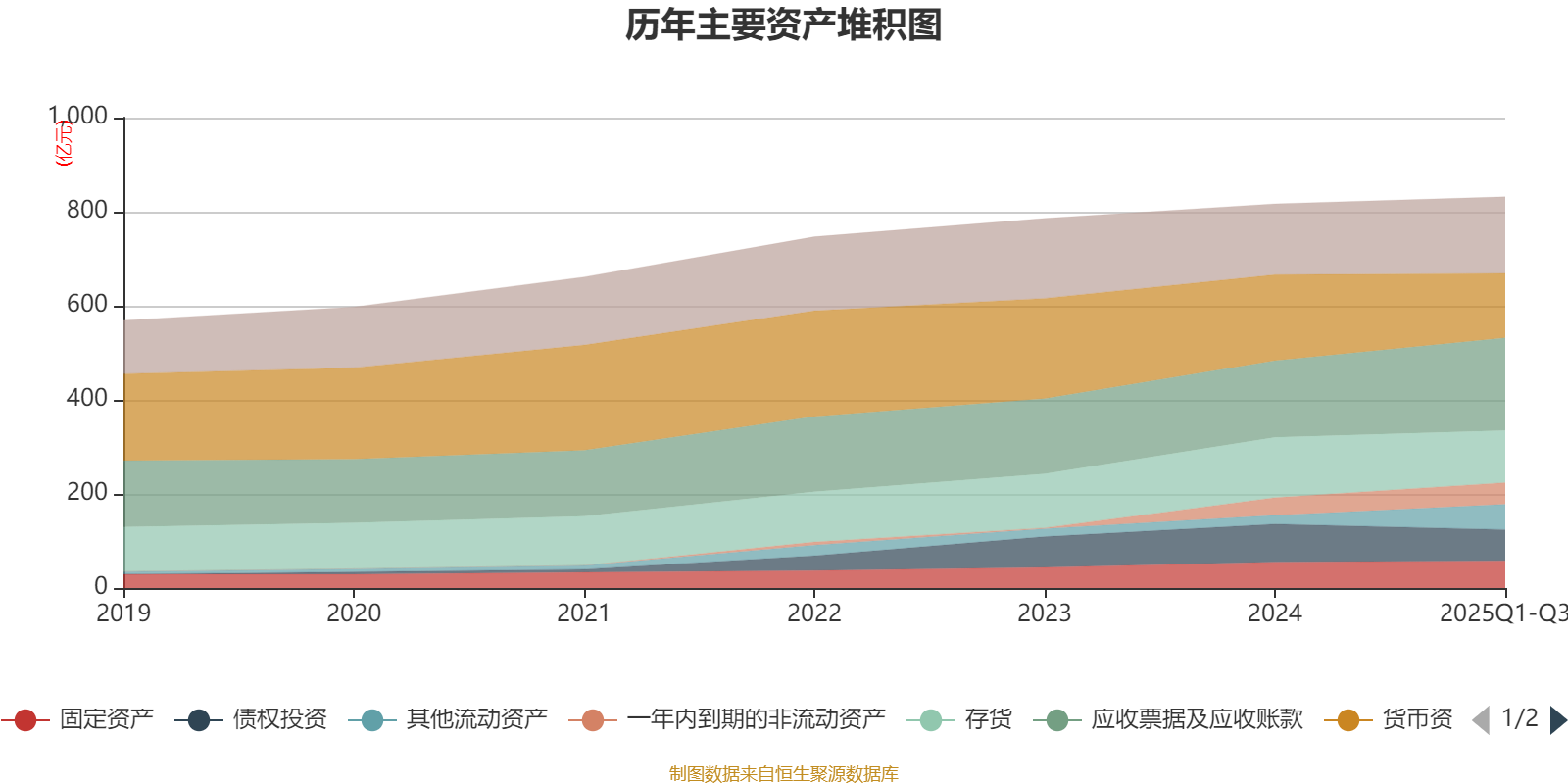 资产重大变化方面,截至2025年三季度末,公司货币资金较上年末减少24.98%,占公司总资产比重下降5.89个百分点;其他流动资产较上年末增加188.34%,占公司总资产比重上升4.19个百分点;应收票据及应收账款较上年末增加20.85%,占公司总资产比重上升3.73个百分点;存货较上年末减少13.51%,占公司总资产比重下降2.36个百分点。