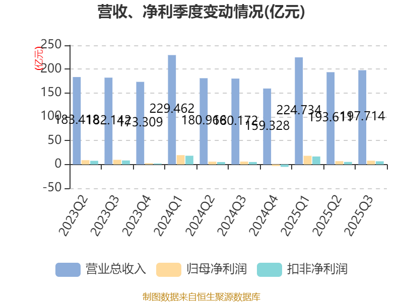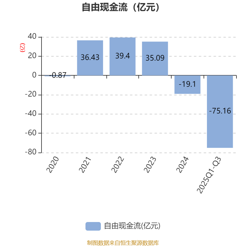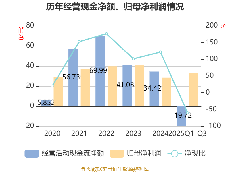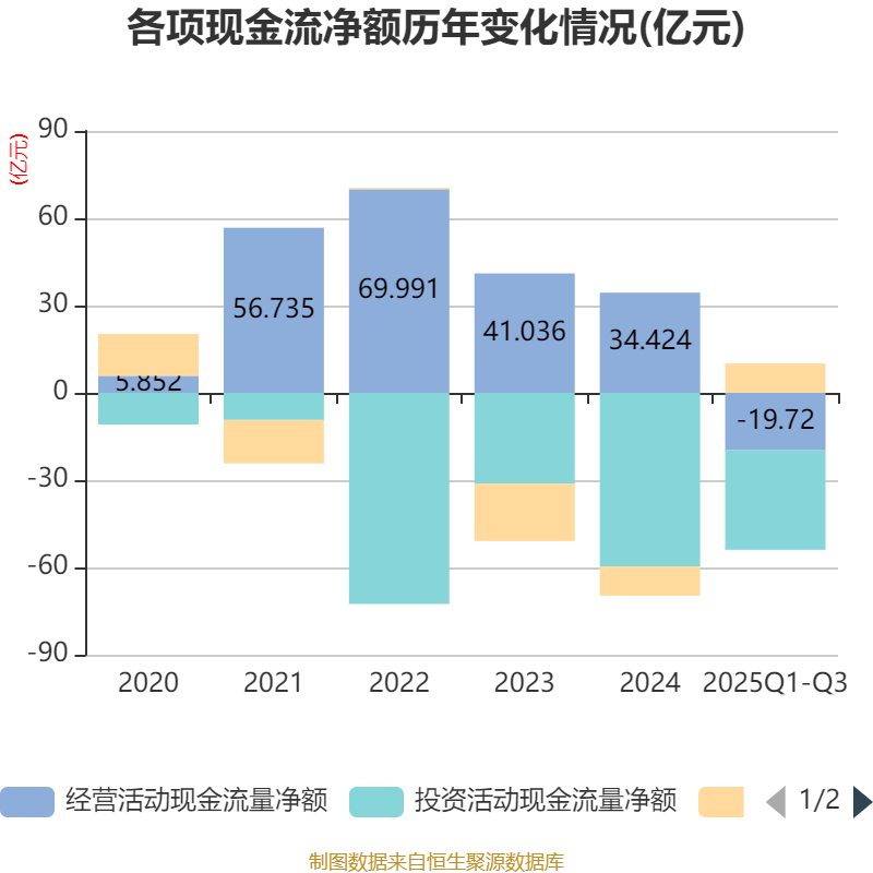 2025年前三季度,公司经营活动现金流净额为-19.72亿元,同比减少12.21亿元;筹资活动现金流净额10.06亿元,同比增加4.19亿元;投资活动现金流净额-34.21亿元,上年同期为-42.4亿元。