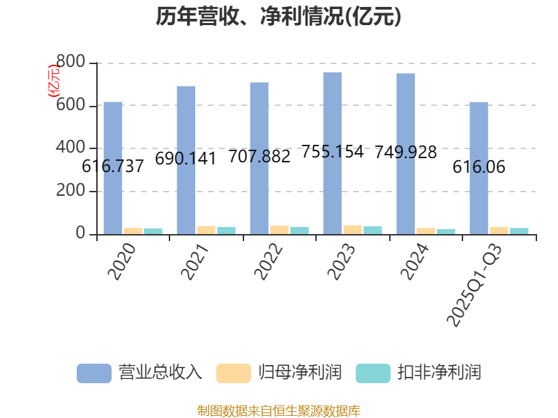 中证智能财讯白云山(600332)10月29日披露2025年第三季度报告。前三季度公司实现营业总收入616.06亿元,同比增长4.31%;归母净利润33.1亿元,同比增长4.78%;扣非净利润28.69亿元,同比增长0.48%;经营活动产生的现金流量净额为-19.72亿元,上年同期为-7.51亿元;报告期内,白云山基本每股收益为2.036元,加权平均净资产收益率为8.88%。