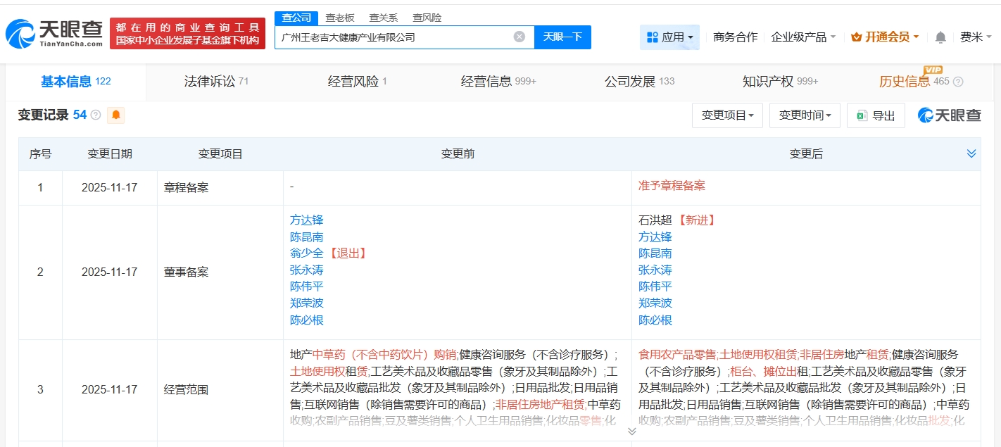 每经AI快讯,天眼查工商信息显示,近日,王老吉关联公司广州王老吉大健康产业有限公司发生工商变更,注册资本由9亿元人民币增至10亿元人民币,增幅约11%,同时发生高管变更。广州王老吉大健康产业有限公司成立于2012年2月,法定代表人为陈昆南,经营范围包括食用农产品零售、土地使用权租赁、非居住房地产租赁等。股东信息显示,该公司由白云山(600332)全资持股。