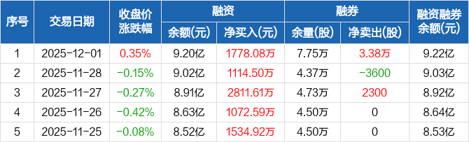 融资方面,当日融资买入3749.76万元,融资偿还1971.68万元,融资净买入1778.08万元,连续8日净买入累计9018.34万元。融券方面,融券卖出3.38万股,融券偿还0股,融券余量7.75万股,融券余额200.65万元。融资融券余额合计9.22亿元。