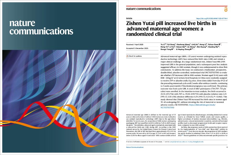 该项研究成果论文(Zishen Yutai Pill increased live births in advanced maternal age women: A randomized clinical trial;DOI: 10.1038/s41467-025-67714-4)(《滋肾育胎丸提高高龄妇女活产率:一项随机临床试验》)已在《自然-通讯》在线发表。研究结果表明,白云山中一药业滋肾育胎丸能够显著提高高龄(≥35岁)妇女的新鲜胚胎移植周期活产率(P<0.05),活产率相对提升约23%(RR≈1.23)。