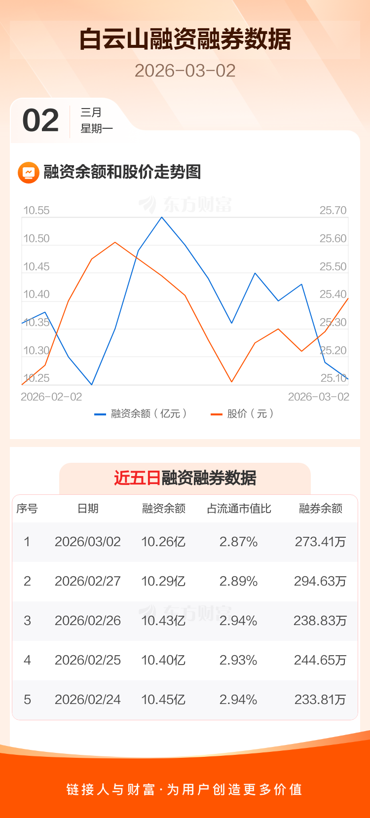 交易所最新数据显示,白云山于2026年3月2日获融资买入2955.69万元,融资偿还3287.75万元,当日融资净偿还332.06万元。目前,该股融资余额10.26亿,占流通市值比例为2.87%。