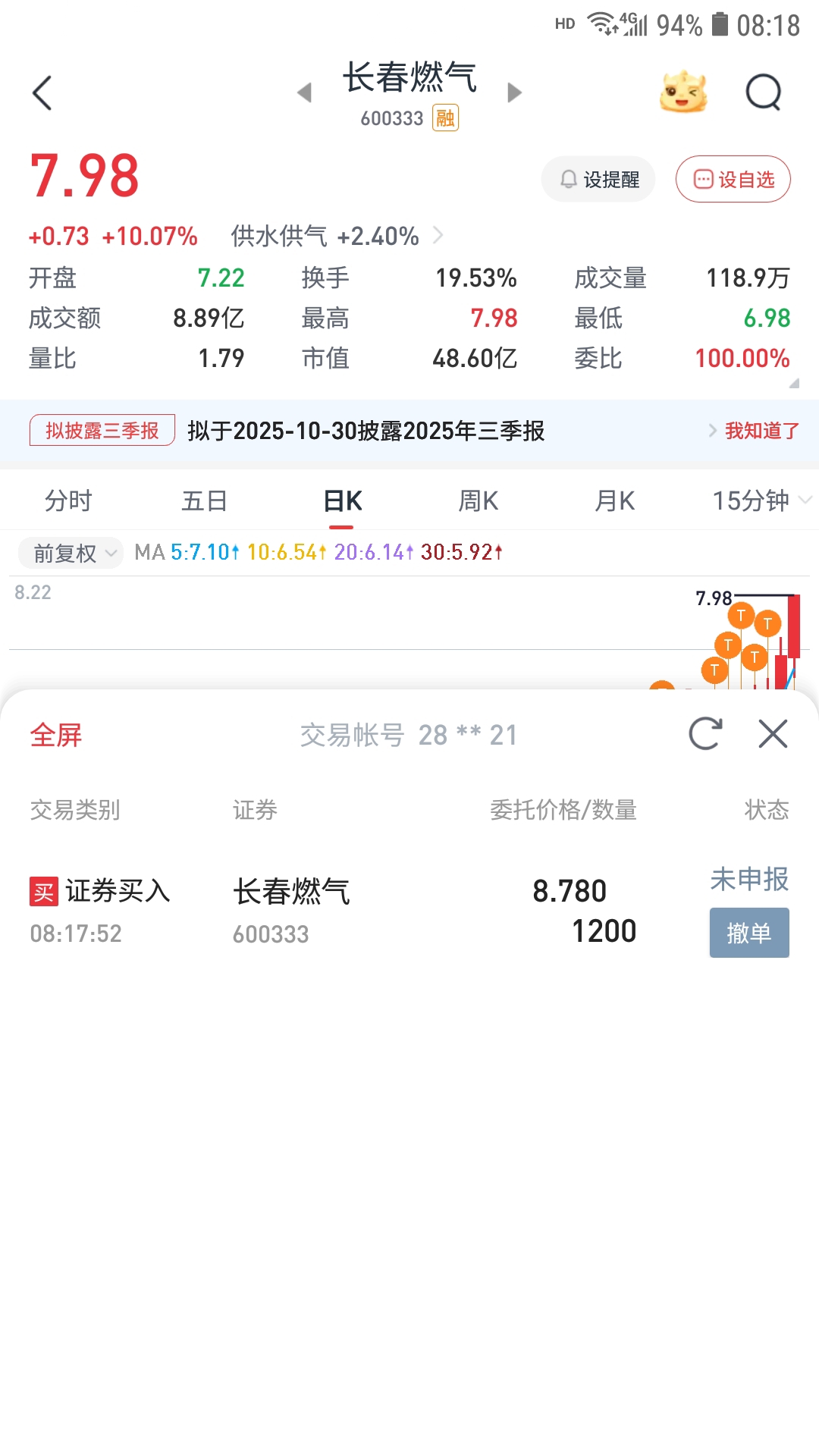 大鹏展翅扶摇10万里,不为做韭菜只为股市里等你归来,无人扶我青云志,我志贷款买山巅。长春燃气暴走模式开启。涨停板已经挂单嗨起来。