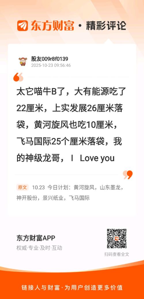 //@股友009r8f0139 :太它喵牛B了,大有能源吃了22厘米,上实发展26厘米落袋,黄河旋风也吃10厘米,飞马国际25个厘米落袋,我的神级龙哥, I Love you $长春燃气(SH600333)$$山子高科(SZ000981)$$国光连锁(SH605188)$