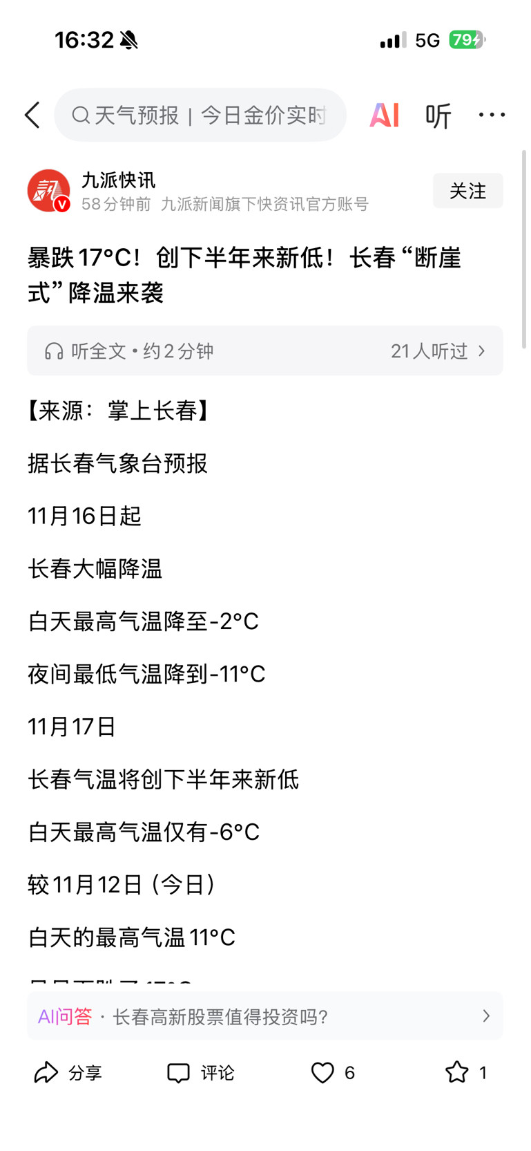 $长春燃气(SH600333)$ 长春断崖式大降温!明天稳了。