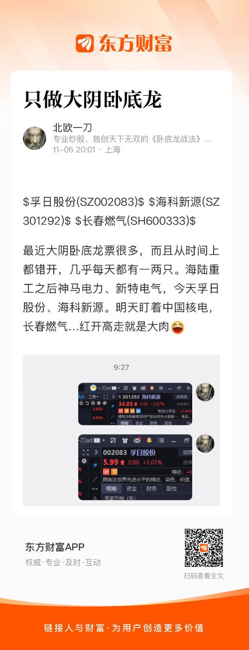 $长春燃气(SH600333)$ $孚日股份(SZ002083)$ $海科新源(SZ301292)$ 恭喜持有孚日股份、海科新源的朋友们,一周翻番。长春燃气终于红开高走爆发,机会是留给有心人的