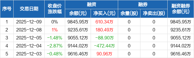 长春燃气:融资净买入610.34万元,融资余额9845.95万元(12-09)