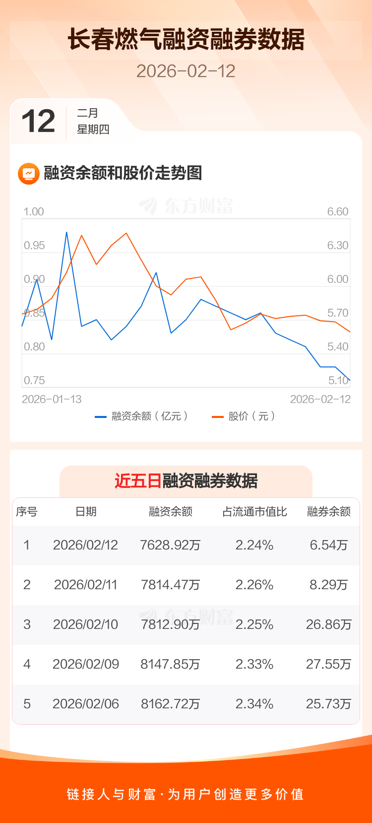 交易所最新数据显示,长春燃气于2026年2月12日获融资买入208.35万元,融资偿还393.89万元,当日融资净偿还185.55万元。目前,该股融资余额7628.92万,占流通市值比例为2.24%。