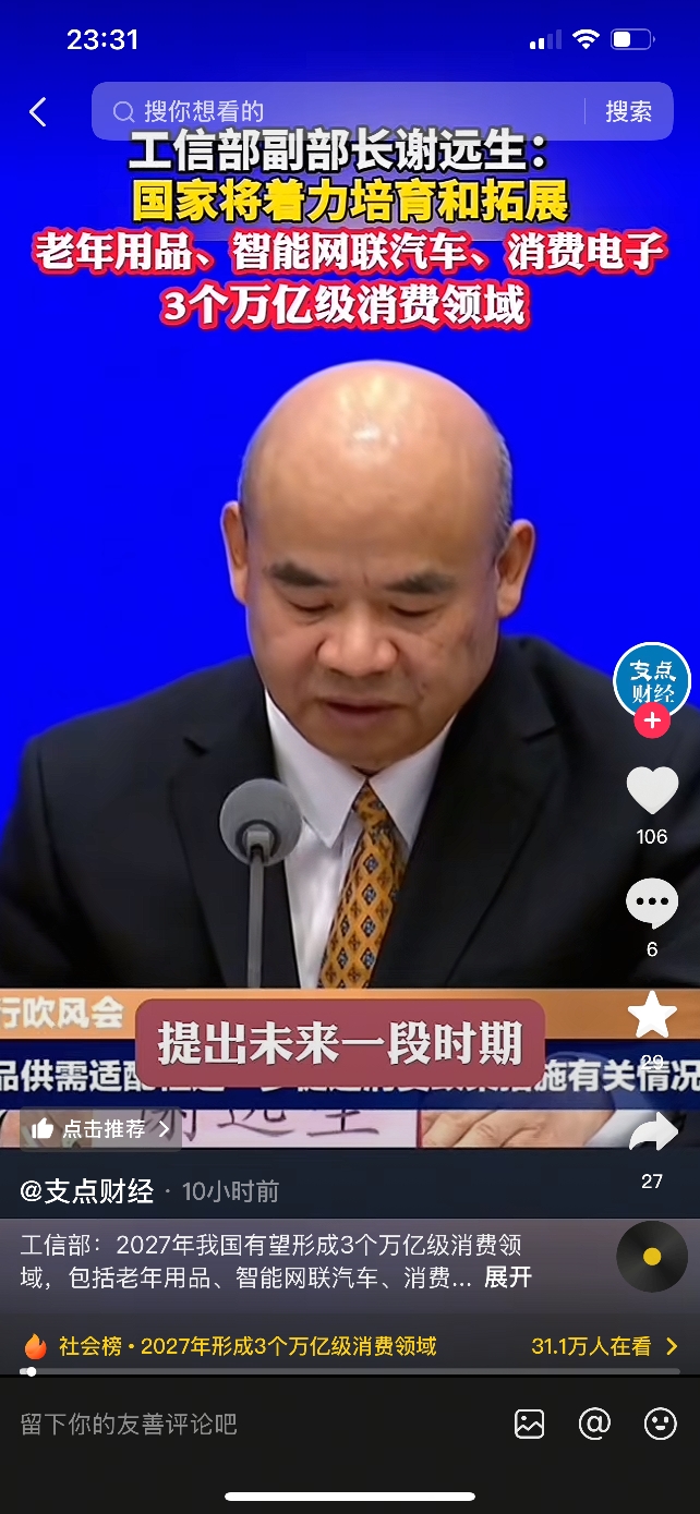 $国机汽车(SH600335)$ 三个万亿级消费领域:老年用品(AI)、智能网联汽车(新能源出口)、消费电子(AI)