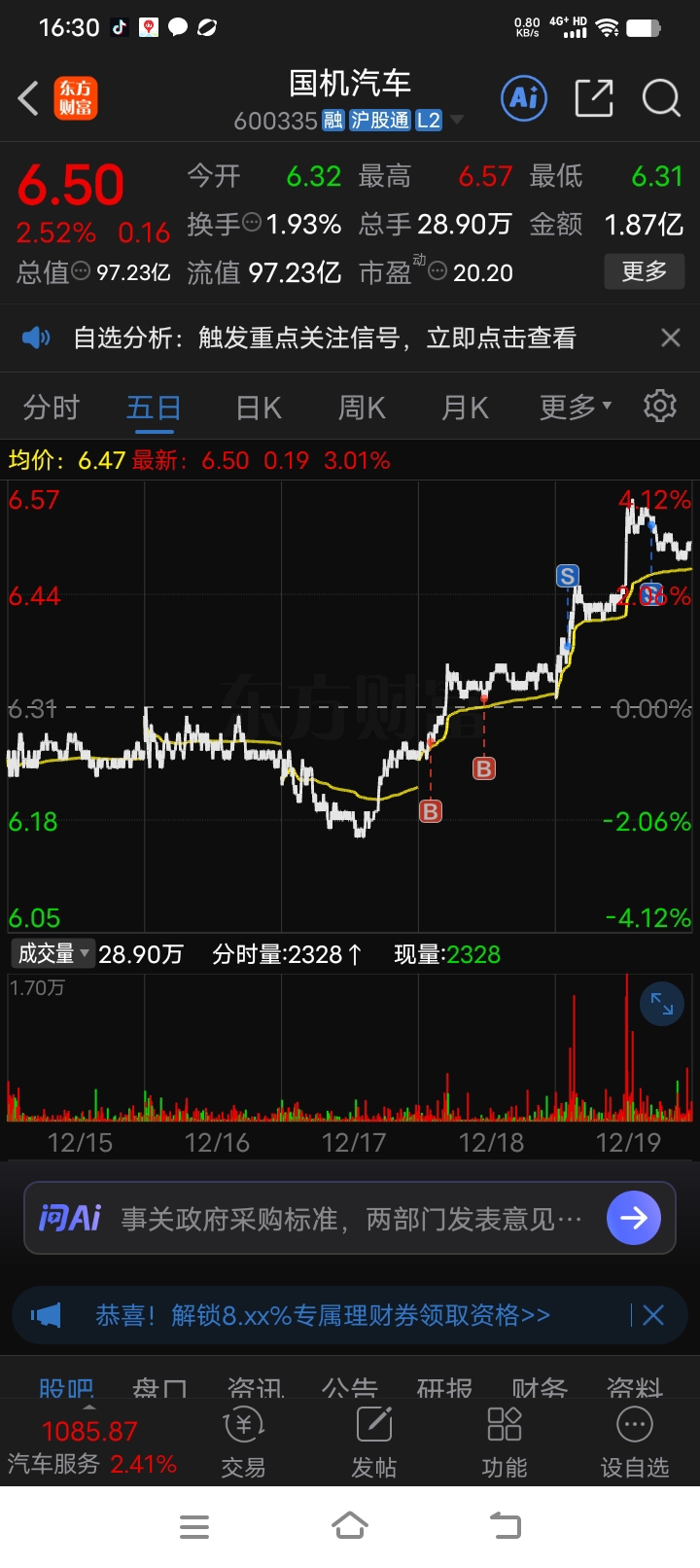 $国机汽车(SH600335)$ 买在起涨点,咬一口就跑…