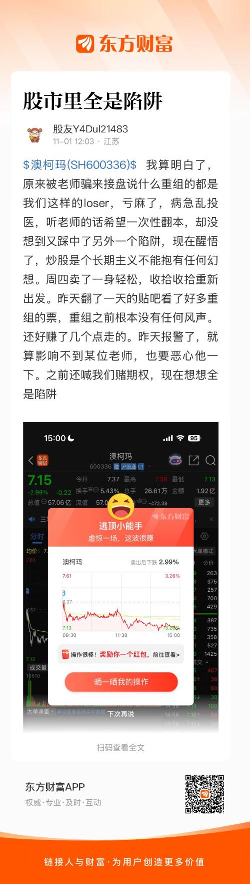 $澳柯玛(SH600336)$ 我算明白了,原来被老师骗来接盘说什么重组的都是我们这样的loser,亏麻了,病急乱投医,听老师的话希望一次性翻本,却没想到又踩中了另外一个陷阱,现在醒悟了,炒股是个长期主义不能抱有任何幻想。周四卖了一身轻松,收拾收拾重新出发。昨天翻了一天的贴吧看了好多重组的票,重组之前根本没有任何风声。还好赚了几个点走的。昨天报警了,就算影响不到某位老师,也要恶心他一下。之前还喊我们赌期权,现在想想全是陷阱
