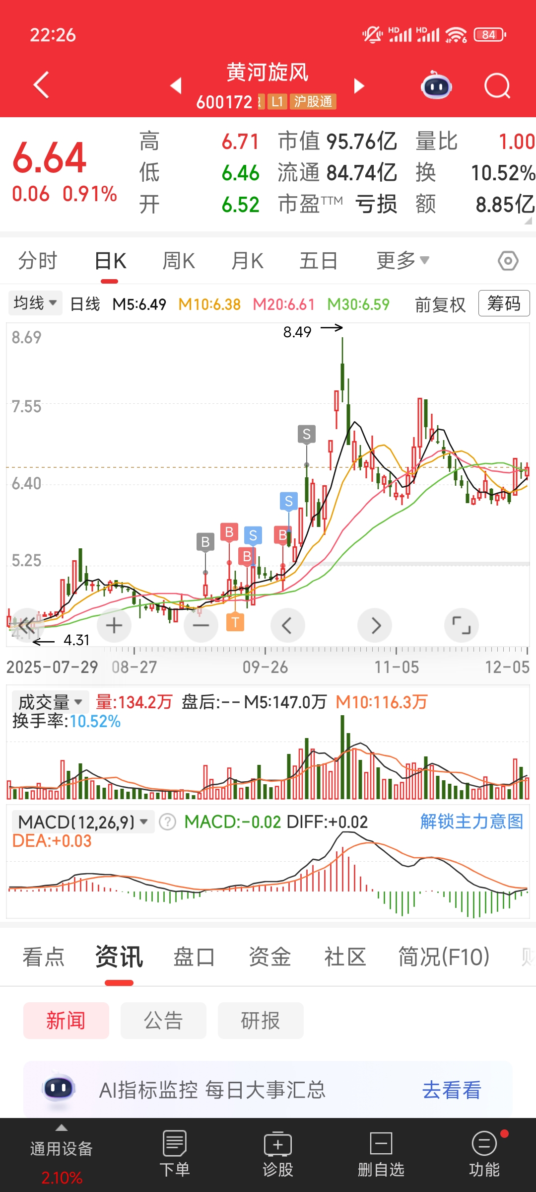 5、黄河旋风:仓位不多,吃了点蚊子肉,没想到钻石行情这么好,主要是仓位不愿挪过来,和黄河信产的预期也在,目前在钻石行情震荡中,风险较高。