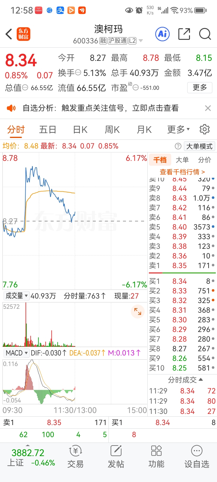 $澳柯玛(SH600336)$ 有啥情况啊?异动,放量,长长的上影线